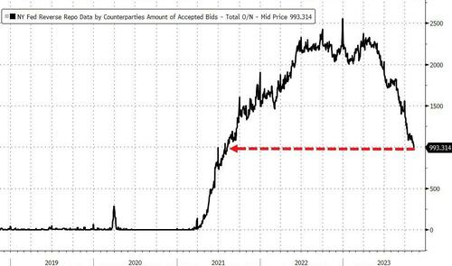 周四,94家对手方(货币市场基金和其他符合条件的公司)在美联储隔夜逆回购协议(RRP)工具中存放了总计9930亿美元的资金。这是隔夜逆回购工具用量自2021年8月10日以来首次低于1万亿美元大关。