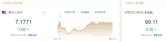 11月10日,人民币中间价报7.1771,上调1点,上一交易日中间价报7.1772。