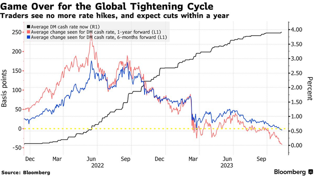 利率交易员现在押注,一代人以来最剧烈的全球紧缩周期已经结束,货币宽松将从2024年年中开始。