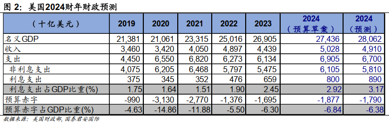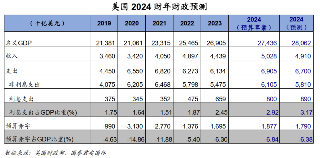 但利息支出的超预期增长以及国防预算的提高,将会限制财政开支的实际削减幅度。美国国会预算办公室于2023年3月的预测显著低估了各期限美债收益率水平,我们假设仅2023年政府债务展期将造成平均利率比CBO的设定高出0.5个百分点,未来10年平均利率则高出1个百分点(利率水平测算详见报告《美国:10年美债利率会破5么?》),按此测算,美国2024财年利息支出可能会进一步扩大至8,900亿美元,占GDP比重将达到3.2%。综上所述,基于对可选支出上限调降以及利息支出上修的考量,我们认为2024财年美国联邦政府支出将扩大至6.7万亿美元。