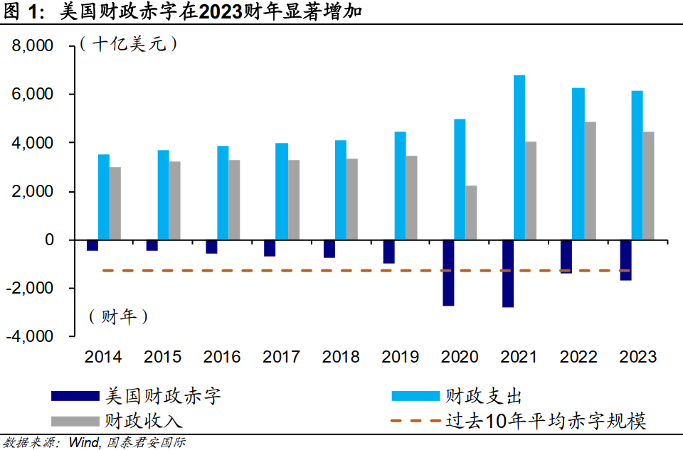 随着加息周期渐入尾声,美国财政部成为市场新的“焦点”。而在连续的评级调降后,扩张性财政政策的弊端也开始浮出水面。在刚刚结束的2023财年,美国财政赤字同比增长23%至1.7万亿美元,占GDP比重约为6.3%,远高于5.8%-5.9%的预算值。