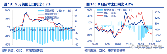 全球贸易:9月美国进口同比-2.7%,出口同比0.5%,贸易逆差扩大至615.4亿美元。9月日本出口同比4.2%,进口同比-11.9%,贸易逆差缩小至4341.4亿日元。