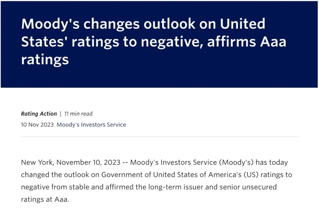 美东时间11月10日,国际评级机构穆迪宣布将美国的主权信用评级展望从“稳定”调整为“负面”,不过依然维持在Aaa的最高评级。