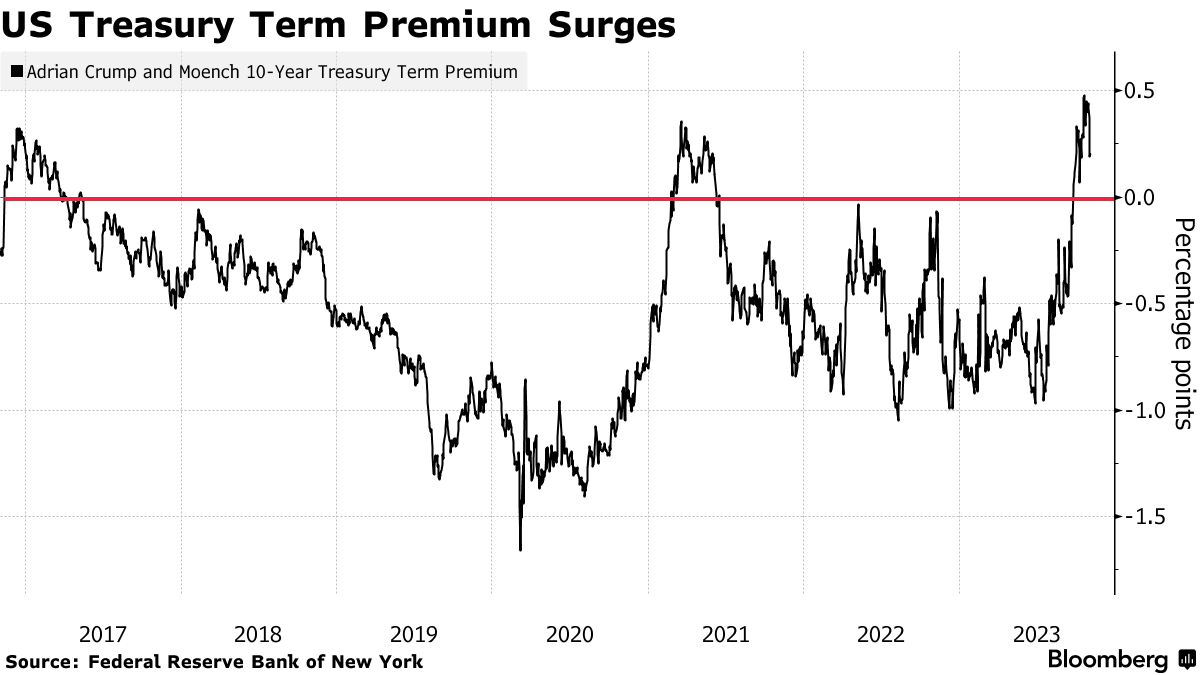 根据纽约联储广泛遵循的ACM模型(以其创始人托比亚斯·阿德里安、理查德·克伦普和伊曼纽尔·莫恩奇的名字命名),期限溢价在2020年3月触及创纪录的低点-1.66个百分点。然而,从7月中旬到10月中旬,它却一路狂飙。在此期间,该指标飙升超过1.3个百分点,自2021年以来首次转为正值。