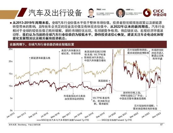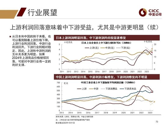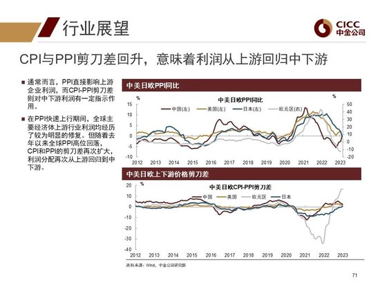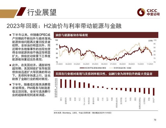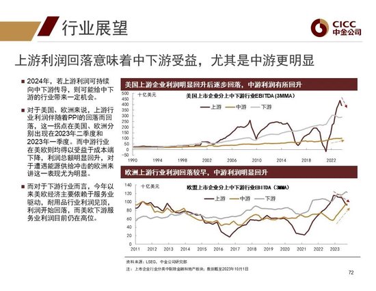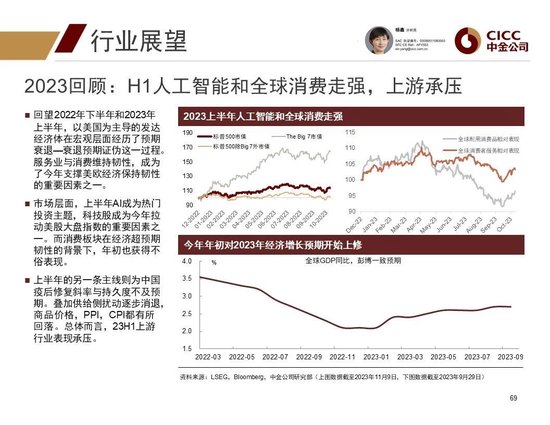 从全球行业来看,2023年上半年人工智能和全球消费走强,下半年以来油价抬升和利率上行带动能源和金融板块表现。向前看,若美欧经济放缓,上游大宗商品价格回落,加上利率下行,上游利润或将持续向中下游传导,中下游(尤其中游)受益,建议关注中游制造和下游消费板块中的结构性机会。在这份报告中我们分上游(原材料、能源及大宗),中游(制造业及TMT)和下游(大消费)对研究部国际组现覆盖的全球行业分别进行了更深入的讨论。