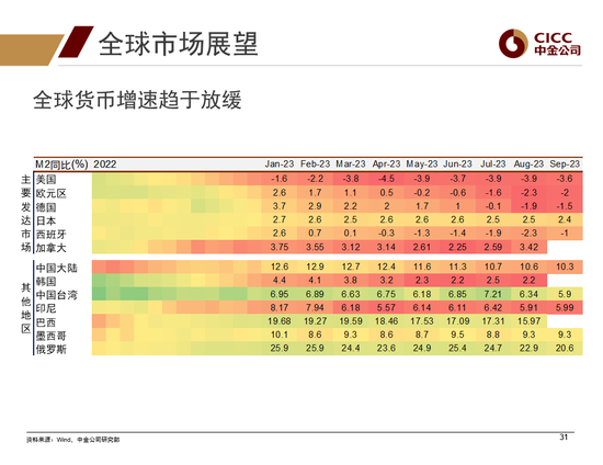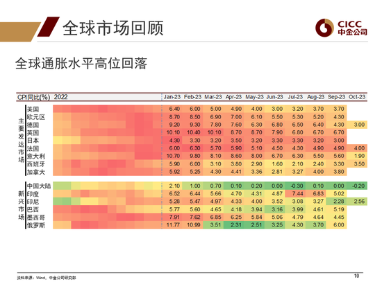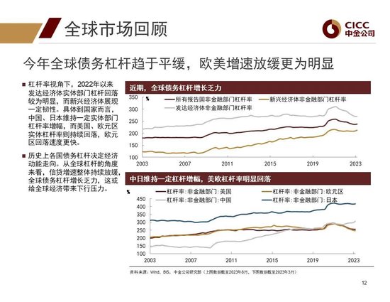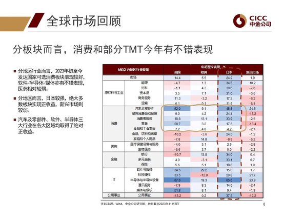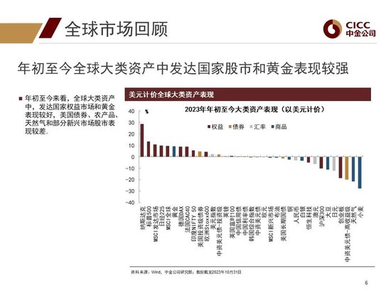 2023年全球市场持续动荡。经济方面,美国经济展现超预期韧性,但欧洲整体偏弱,制造业投资较快的新兴市场较好。全球通胀水平普遍高位回落,但仍高于疫情前水平。欧美央行快速收紧货币政策,信贷增速有较明显回落。资产方面,市场在“更高更久”(Higherfor longer)和“软着陆”中持续博弈。今年全球大类资产中发达国家股市(日本,美国)和黄金表现较强;分板块而言,消费和人工智能在发达市场为两大重要主题。