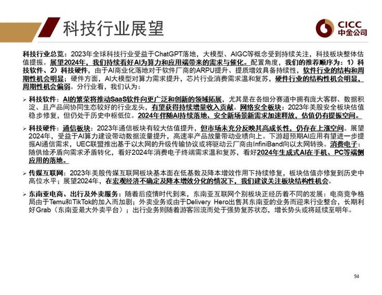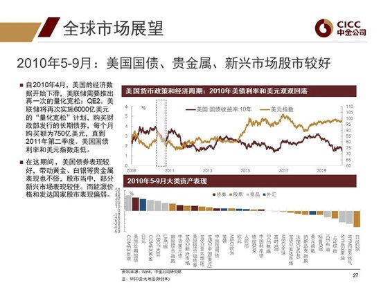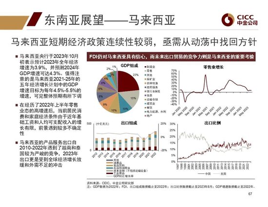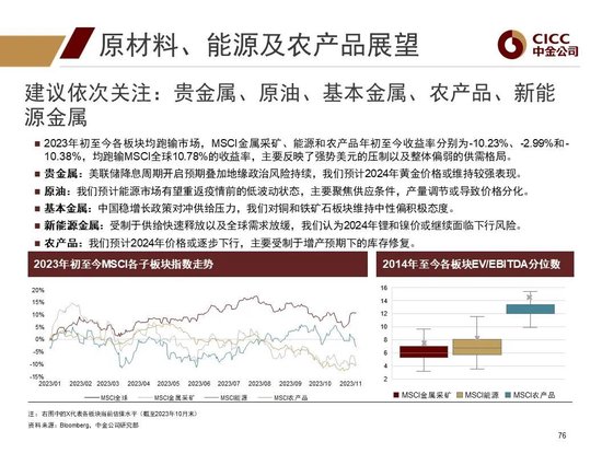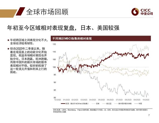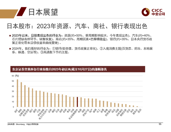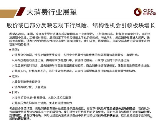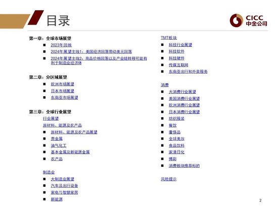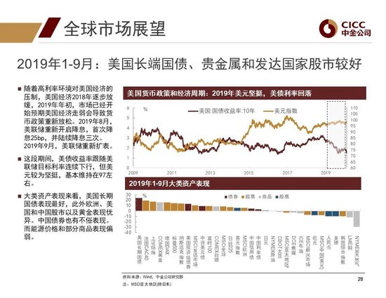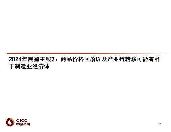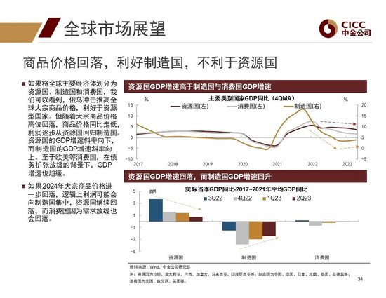 2023年全球市场持续动荡,其中,美国经济展现超预期韧性,欧洲整体偏弱,制造业投资较快的新兴市场表现较好。展望2024,我们认为大致可以遵循两条主线:1)受到高油价、高利率、高工资的影响,企业盈利面临成本压力,2024年经济增速或持续向下,带动美债利率和美元回落。2024年机会可能在美国国债、贵金属、日本和新兴市场股市以及非美货币;2)全球需求下行和流动性收紧都将持续压制大宗商品价格,上游利润回落,并可能会向制造国集中;同时考虑到全球产业链重组带来的影响,我们更看好以制造业为主的新兴市场(如东南亚、印度、墨西哥等)及发达地区(日本)的表现。行业层面,若上游利润持续向中下游传导,建议关注中游制造和下游消费板块中的结构性机会。