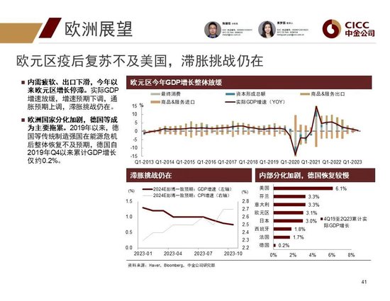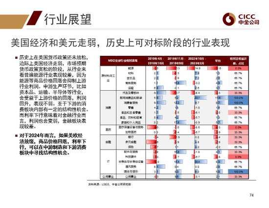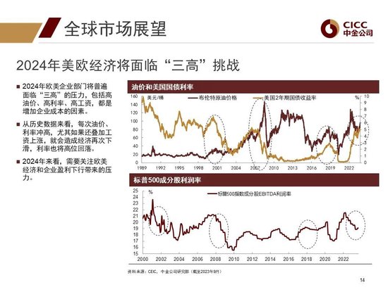 展望2024年,我们认为大致可以遵循两条主线。首先,受到高油价、高利率、高工资的影响,欧美企业普遍面临成本抬升的问题,企业盈利面临压力,2024年经济增速或持续向下,带动美债利率和美元回落。遵循这条主线,若复盘历史上美国经济走弱、美债利率下行阶段对我们的启示,我们认为2024年机会可能在美国国债、贵金属、日本和新兴市场股市以及非美货币。