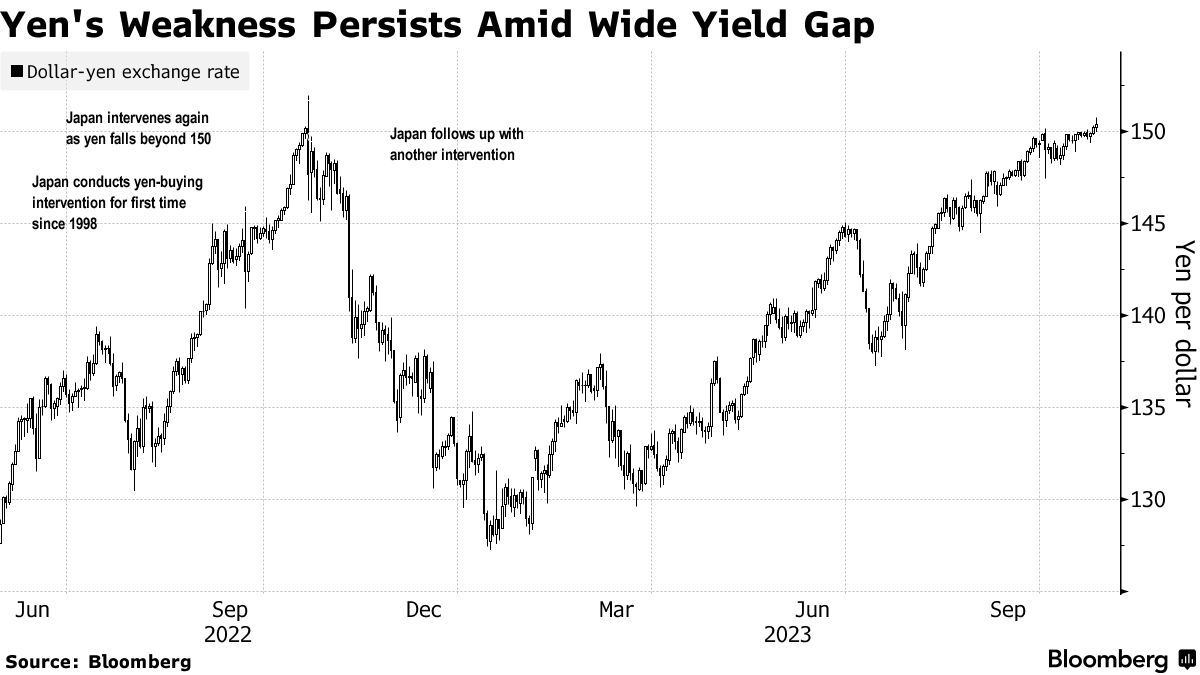 在日美利差持续扩大的推动下,日元陷入了持续贬值的趋势之中。尽管日本央行在10月31日进一步放松了收益率曲线控制(YCC)政策,但仍坚持其负利率政策,这一决定令寻求触发日元持续反弹的交易员感到失望。