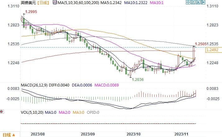 英镑兑美元周二(11月14日)升至1.25上方的两个月高位,此前美国公布10月通胀数据,显示美国通胀已放缓,程度超过市场预期。周三亚市,英镑兑美元守住隔夜大部分涨幅,目前交投于1.2492附近。