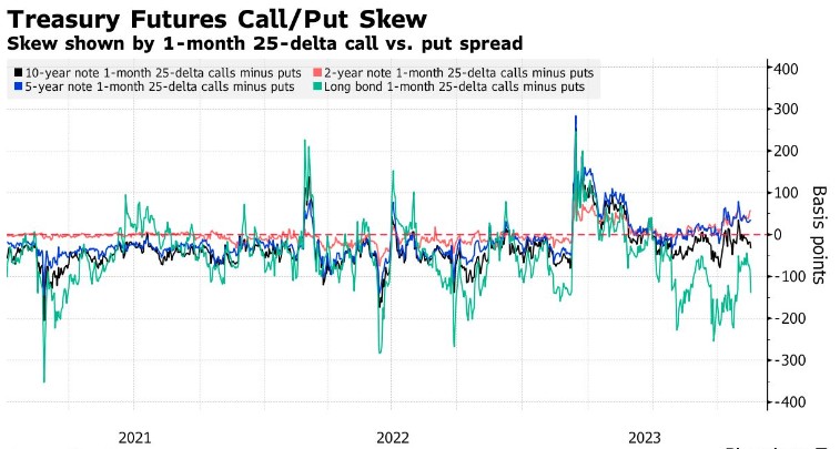 相较于对冲收益率曲线前端和后端利率上升的风险,为对冲长期美债抛盘而支付的溢价偏差变得更为昂贵,长期美债期货相对于2年期和5年期合约的期权偏差就体现了这一点。自上周初以来,30年期美债收益率一直在4.59%至4.835%之间波动。