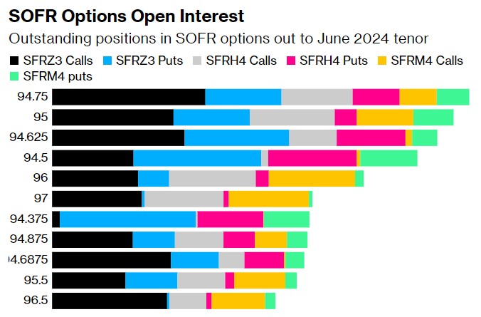 周二的通胀数据公布后,市场出现了鸽派保护的需求,目标是在2024年3月的SOFR期货中定价最多降息50个基点。与此同时,现有的鹰派结构似乎已被清算,交易员预计美联储加息周期将结束。在2024年6月到期的期权中,就未偿未平仓合约而言,执行价94.75和95.00的合约仍然是最活跃的。
