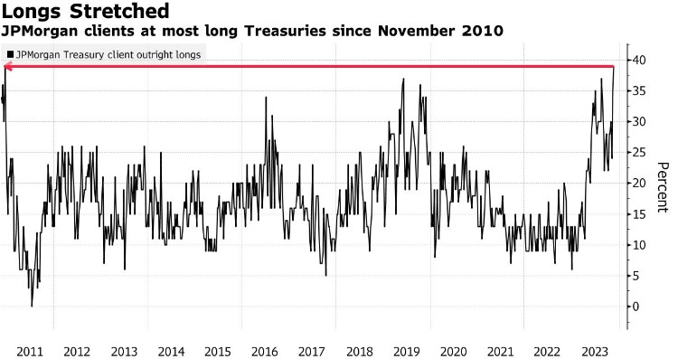截至周一的数据显示,摩根大通对美国国债客户的最新调查显示,多头仓位跃升至2010年11月以来的最高水平,脱离中性仓位。周二,在10月份的通胀报告公布后,债券市场出现了大幅上涨。调查显示,净多头仓位为6月以来最高。