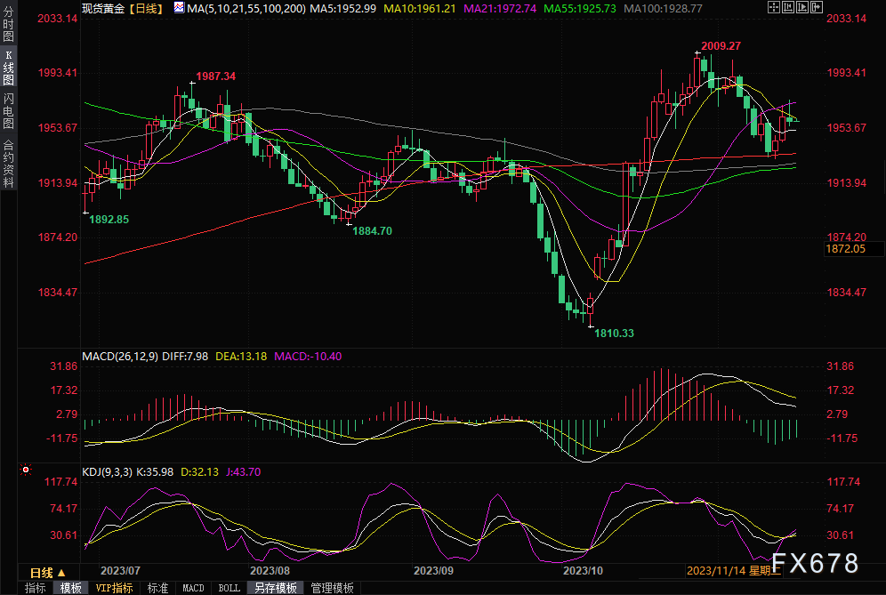 (现货黄金走势图)现货黄金周三收跌0.19%,收报1959.25美元/盎司。