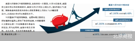 另一方面,美国10月CPI数据释放的信号也迅速传递至金融市场。数据发布后,美元指数短线大幅走低,日内收跌1.51%。非美货币集体走高,其中欧元对美元短线走高80点,日内收涨1.69%,离岸人民币对美元汇率达到近两个月以来新高,盘中一度涨超500基点,日内收涨0.56%。美股三大股指期货短线拉升,均涨超1%。