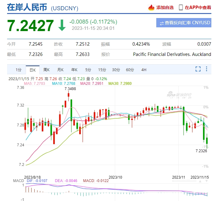 截至11月15日晚间,境内在岸市场人民币对美元汇率触及7.2427,较前一个交易日收盘价大涨465个基点,盘中一度创下8月中旬以来最高值7.2326;境外离岸市场人民币对美元汇率徘徊在7.2521,过去两个交易日涨幅一度超过600个基点。