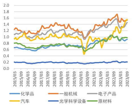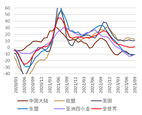 汽车出口是日本出口的重要组成部分,虽然今年以来日系车在中国大陆销售情况不佳,但日系车在美国、欧洲仍占有一定市场。去年以来因车载半导体不足,导致汽车出现供给不足的情况,但今年以来该情况有所缓解,日本的汽车生产情况有了明显的改善,也带来了汽车出口的增加(图表8)。分地域来看,日本面向欧美的出口相对比较坚挺的同时,但面向亚洲的出口走势相对比较疲软(图表9)。往中长期看,日本的商品出口也存在一定不确定性,伴随欧美央行的加息,日本面向大部分经济体的出口同比呈现趋势性下行(图表9),我们认为未来海外若进一步走弱,日本的出口或难维持在高位。但相对来看,虽然边际放缓,但日本的出口同比仍未正数,好于其他亚洲制造业国家。