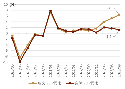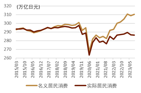增速环比为负、但名义同比继续高速增长:2023年11月15日,日本内阁府公布了7-9月GDP的一次统计速报数据,实际GDP环比折年-2.1%(图表1),弱于市场预期的-0.4%以及前值的+4.5%;名义GDP环比折年-0.2%(图表1)、低于前值的+10.5%;无论是实际还是名义,本季度GDP环比转负比较明显。发达国家的GDP增速统计一般使用环比折年较多,但GDP环比折年计算的前提为季节调整,在做季节调整之时免不了会出现一定的误差。排除季节调整的日本实际与名义的GDP同比分别为1.2%与6.4%(图表2),名义同比增速为疫情以来的最大。同时,日本央行计算的日本潜在GDP增速仅为0.6%左右(图表3),2023年以来的日本GDP增速明显高于潜在增速。