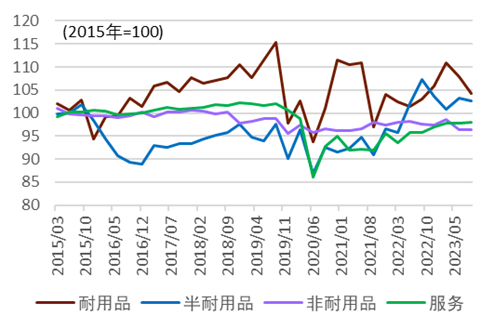 图表13:各类实际消费的走势(2015年=100、季节调整后)
