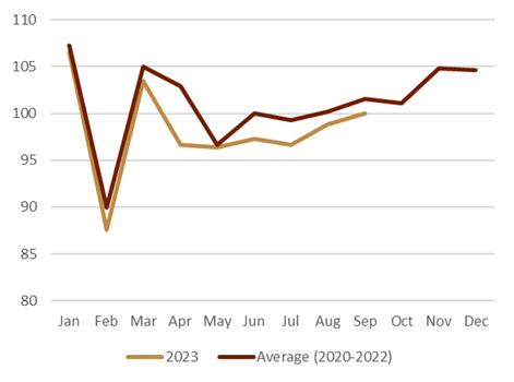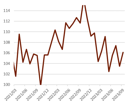 入境游客消费在GDP统计中算作日本服务的出口,虽然受季节调整的影响,7-9月的服务出口为环比小负,但2023年全年来看入境日本游客的消费也会给GDP的出口部门带来正面影响。2023年10月,入境日本游客人数已超过疫情前同期的水平(图表10),同时、人均的消费额与疫情前同期相比增加29%(图表11)。2019年时入境游客消费额占名义GDP约1%,我们认为2023年或能取得高于1%的好结果。
