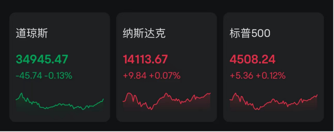 美东时间周四,美股三大指数涨跌不一。截至收盘,道指下跌45.74点,跌幅0.13%,报34945.47点;纳指上涨9.84点,涨幅0.07%,报14113.67点;标普500指数上涨5.36点,涨幅0.12%,报4508.24点。