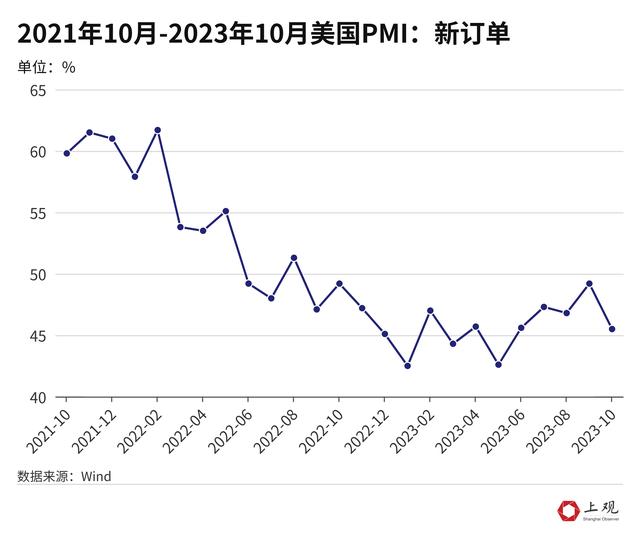 但加息后,需求迅速收缩,在去年9月PMI指数-新订单跌落50%,且截至今年10月,已连续14个月低于分界点,表明制造业处于冷却阶段。