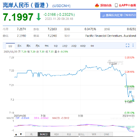 11月20日,离岸人民币快速拉升涨破7.20关口,为8月8日以来首次,日内升值逾160点。