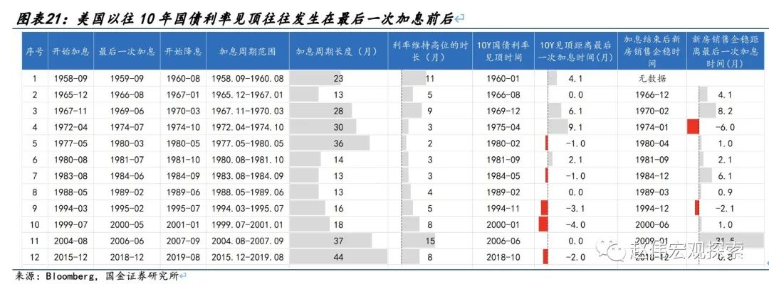 (8)美联储加息周期接近尾声,也有助于缓解利率进一步创新高的风险。美联储11月例会决定继续暂停加息,鲍威尔表态将“谨慎前行”。在10月美国通胀、消费、PMI等数据均有所走弱的条件下,本轮加息周期已进入高利率阶段。参考历史上的12轮加息周期经验规律,10年国债利率往往在最后一轮加息前后见顶,最长滞后六到九个月左右。虽然市场定价的降息时点尚有半年以上,但加息周期告一段落有助于缓解明年长端国债利率进一步创新高的风险。