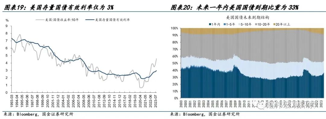 2024年付息压力虽上升,但美国政府债务风险依然可控。未来一年内,存量国债中约8.5万亿美元将到期,占存量国债的比重为33%,低于疫情期间的37%、金融危机时期的46%、以及2003年之前的平均水平40%。截至9月,美国存量国债有效利率仅为3%,考虑到明年到期量占比上升幅度有限,预计明年利率上行的债务风险依然较为可控。