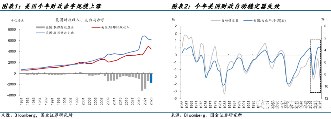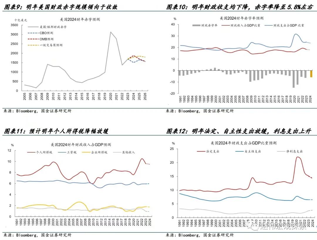 (1)今年美国财政发力的背后是财政自动稳定器失效。财政中的税收、社保等项目往往发挥自动稳定器的功能,当失业率较低时,倾向于增收减支。但今年在低失业率的条件下,财政赤字依然扩大,原因在于通胀调整的扣除额上升使财政收入被动减少,社保支出被动扩大。随着通胀放缓,这一反常因素明年将会减弱,有助于削弱明年赤字规模。