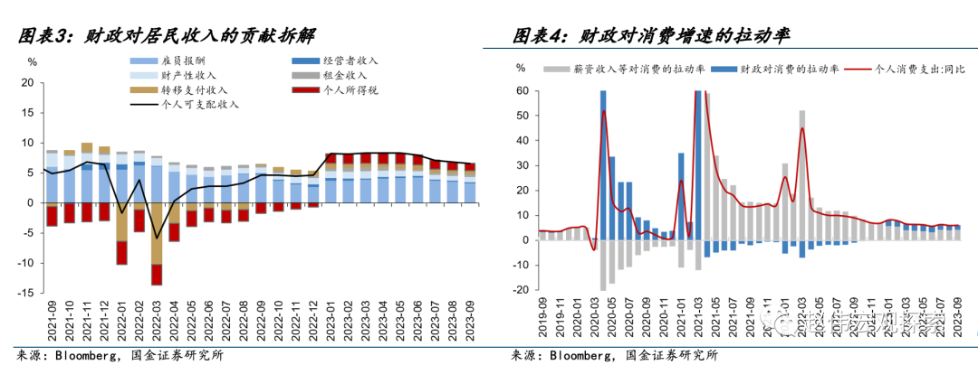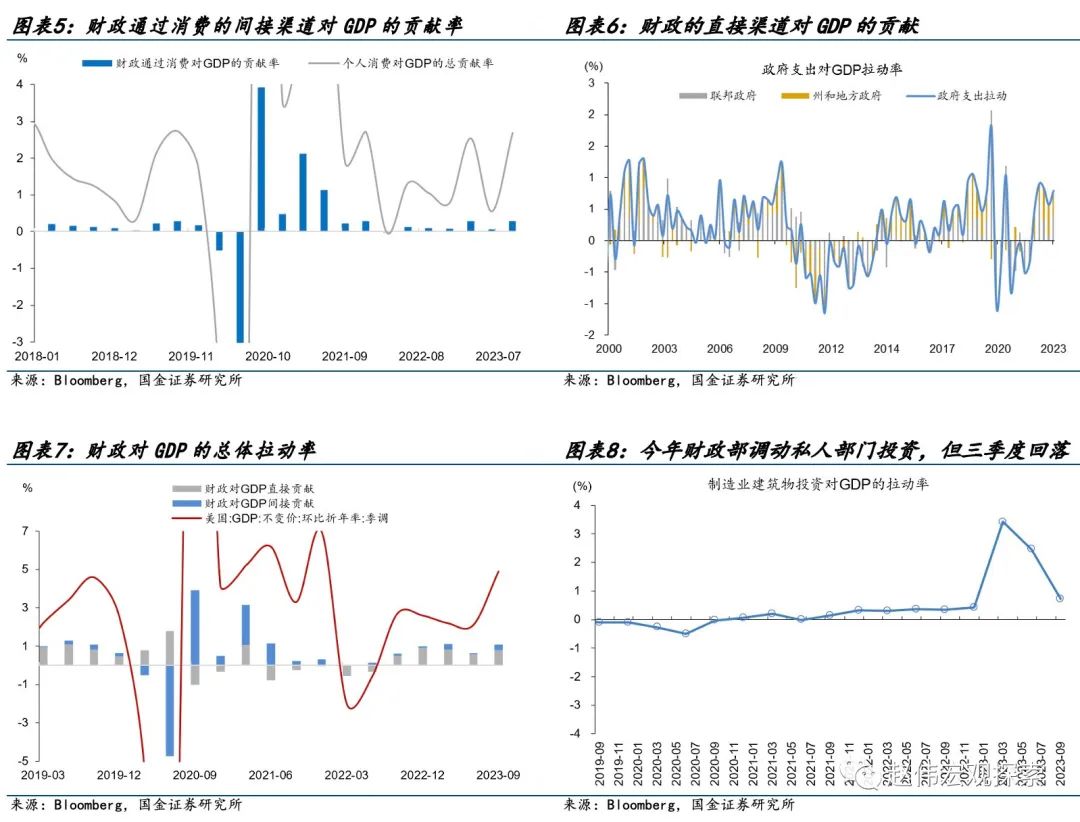 (3)今年美国财政拉动GDP增长0.8个点,全年GDP增速预计约为2.1%,财政对GDP增速的贡献占比约为30%。直接渠道方面,财政通过政府消费和投资拉动GDP增长0.7个点,除疫情两年外,是近十年次高水平。间接渠道方面,财政通过补贴及减税影响居民消费,我们测算显示,前三季度,财政通过消费的间接渠道拉动GDP增速0.21个点。