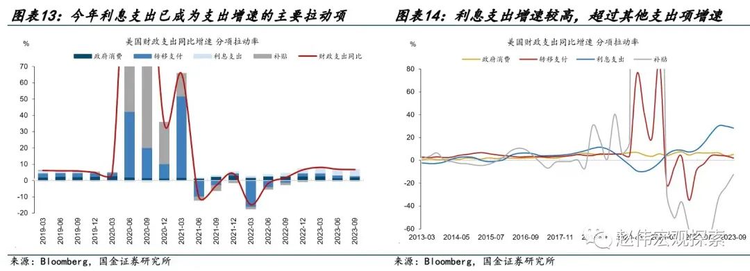 明年财政有效支出萎缩,拖累财政的支撑效果。按照经济性质,美国财政支出可分为政府消费支出、转移支付、利息支出以及补贴支出。其中补贴支出是政府向特定行业、企业提供的财政支持,转移支付则主要是向公民个人提供的福利支出等。利息支出由于不产生经济效益,因而可以被视为无效支出。四个分项中,政府消费支出占比40%,转移支付占44%,利息支出占14%,补贴支出占1%。今年下半年利息支出增速上涨,已成为财政支出的主要拉动项。三季度财政支出同比6.7%,其中3.9个百分点是由利息支出贡献,明年利息支出增速和占比将上涨,财政有效支出仍会进一步回落。