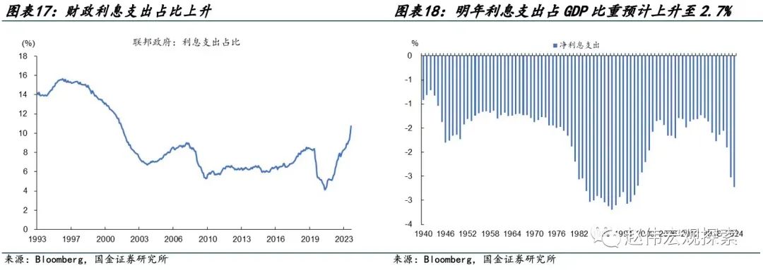明年财政付息压力上升,但利息负担低于90年代高点。随着美联储维持高利率的时间拉长,美国财政利息支出压力已有明显攀升,截至今年10月,联邦政府利息支出占总支出比重升至11%(12个月移动平均),利息占GDP比重今年约为2.5%。中性情景下,明年利息支出占GDP比重预计上升至2.7%,占财政总支出比重预计上升至13%,二者均低于90年代高点水平。