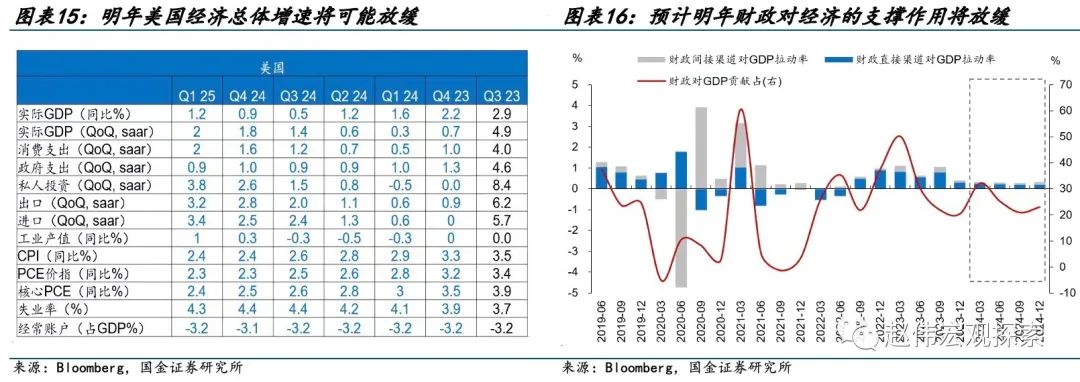 2024年财政对GDP的支撑放缓,预计全年拉动GDP增速0.3个点,财政对GDP增速的贡献率降至24%,逐渐回归常态。参考彭博、IMF等机构的预测,明年美国经济增速预计放缓至1.3%。财政直接支出方面,预计明年对GDP的拉动率预计降低至0.2%左右;间接渠道方面,对GDP增速的拉动率预计降低至0.1%左右,支撑作用较今年减弱。
