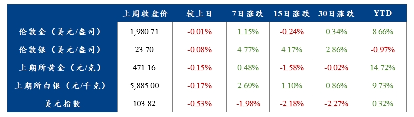 本周备受关注的美国 10 月CPI低于市场预期,刺激市场对美联储加息预期归零,2024年降息预期增强,美元指数和美债收益率共振回落,黄金走高,人民币升值。主要股指上涨,发达市场表现强于A股和港股。原油价格在需求担忧下全周下跌,周五传出OPEC+或再减产100万桶/日的消息,当日油价大幅反弹收复了本周大部分跌幅。