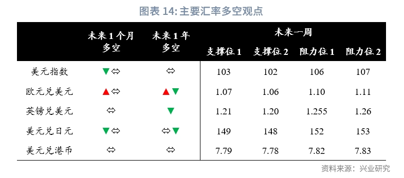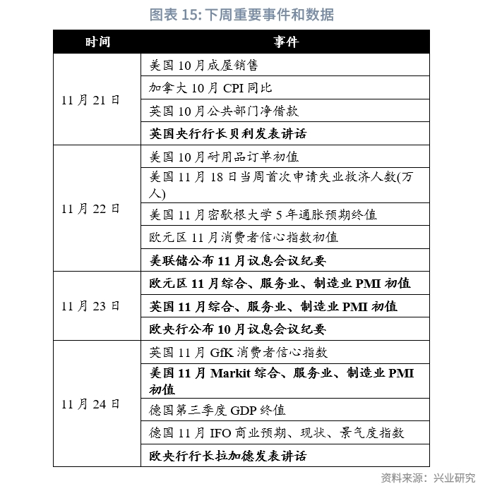 近来美国经济韧性较欧英转弱,市场衰退担忧有所增加。同时受罢工影响,美国最新通胀数据明显回落。在疲软数据面前,联储的鹰派显得相对无力。市场确信联储已告别本轮加息周期,且预计明年将实施更大幅度降息。该交易逻辑短线可能持续,美元指数料继续承压,但也不具备大幅走贬的动力。下周重点关注美联储和欧央行11月议息会议纪要、欧英央行行长发言、美欧英11月PMI初值。