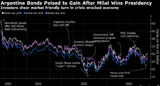 米莱在竞选活动中承诺对他所说的几十年来被误导的政府政策进行彻底的修正。他承诺削减公共支出,并关闭央行,以抑制通胀和增强财政账户,对已经预计另一场违约即将到来的债券投资者来说,这些政策可能是个福音。