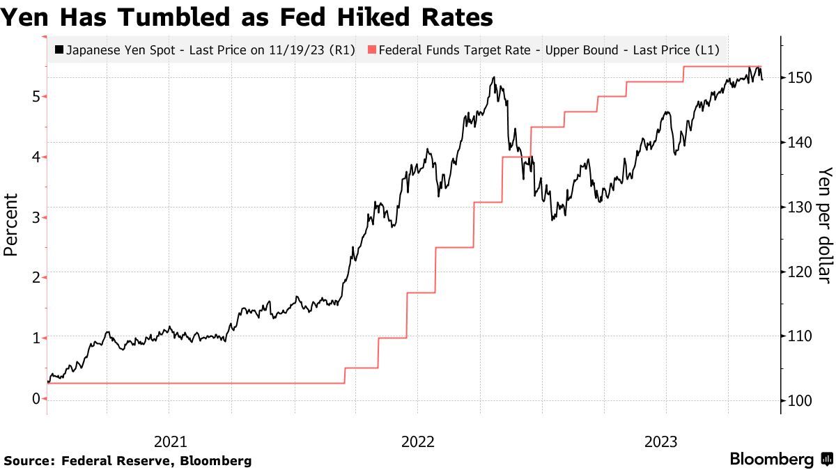 日元在上周一度跌至1美元兑151.91日元,仅略低于2022年10月创下的30年低点,是今年表现最差的10国集团(Group-of-10)货币标的。尽管日本央行放松了对收益率曲线的控制力度,但日元还是继续出现下跌。