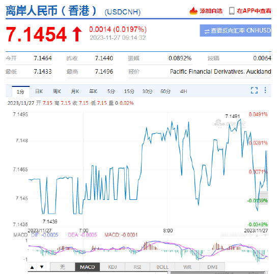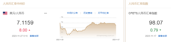 11月27日,人民币中间价报7.1159,下调8点,上一交易日中间价报7.1151。