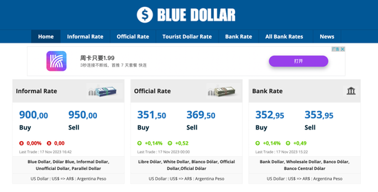 ▲ 目前阿根廷“蓝色美元”汇率已达1:900,高出官方汇率约三倍(2023年11月)。图源:https://bluedollar.net/