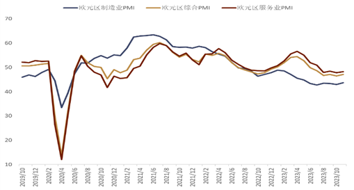欧元区PMI数据小幅超预期 德国经济数据有所好转 上周公布的欧元区11月制造业PMI初值较前值的43.1回升至43.7,稍好于市场预期。但依旧处于自2022年7月以来持续的萎缩区间。服务业PMI初值同样有所回升,从前值的47.8小幅回升至48.2。综合PMI初值录得47.1,好于市场预期的46.8和前值的46.5,但这依旧是连续第6个月低于荣枯线(图表16)。与此同时,欧元区两大经济体仍处于较为疲软状态。德国11月份的经济萎缩有所缓解,综合PMI自前月的45.9回升至47.1,服务业PMI自前月的48.2回升至48.7,制造业PMI自前月的40.8回升至42.3。