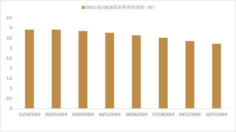 不过11月PMI数据显示德国PMI已是连续第5个月处于萎缩区间,而法国的经济活动11月仍在下滑,11月综合PMI指数录得44.5,低于前月的44.6,服务业PMI自前月的45.2小幅回升至45.3,制造业PMI自前月的42.8回落至42.6。总体看,德国PMI的意外好转有助于抵消法国PMI的意外走弱,而这有可能为欧元的走高提供支撑。此外,德国11月IFO商业预期指数录得 85.2,虽然不及预期的85.8,但好于前值的84.7。在此背景下,市场对ECB明年的利率路径并未出现明显变化,OIS市场预计明年10月前ECB降息总量达到70基点,并且已经完全计价了明年上半年的首次降息(图表17)。此外,上周公布的ECB货币纪要显示[8],