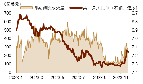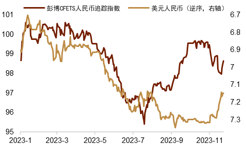 人民币汇率明显走强 如我们此前周报的判断,人民币汇率在技术上破位之后,出现了进一步的走升(详情参考《美元下行态势得以强化》)。上周人民币汇率摆脱了11月以来被动跟随美指走弱而走强的趋势,涨幅在亚系货币中位居前列,并在主要货币中表现居前(图表1)。在岸、离岸汇率和中间价数月来首次实现“三价合一”(图表2)。具体来看,上周美元指数继续走弱,不过速度放缓,美债收益率则反弹走高。外部环境并不支持人民币汇率大幅走强。然而中间价的连续明显高开带动了汇率升值预期,房地产行业的利好消息亦小幅压低了风险溢价。因此我们认为人民币升值动力或主要来自于内部。跨境资金方面,上周北向资金继续流出,不过总体趋势较为温和(图表3),对人民币汇率压力可控。上周人民币对一篮子货币指数亦在稳汇率的进一步发力下转而走高(图表4)。近期人民币汇率所面临的外部压力初步缓解,内部环境亦有所修复。人民币汇率连续两周走强,市场预期改善,外汇市场供求形势出现了好转迹象,人民币交易量明显恢复(图表5)。