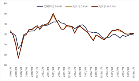 美联储11月FOMC会议纪要,密歇根通胀预期经济数据超预期支撑美元小幅走高 但劳动力市场显示疲软 11月FOMC会议纪要显示[7],美联储决策者集体认为适合一段时间保持高利率,重申将谨慎行事,但并没有暗示结束加息周期的倾向。“所有美联储与会者一致认为,FOMC会谨慎行事,将继续基于未来接收的全部信息及其对经济前景的影响、以及风险平衡而在未来的每次会议上做出相应的决策。若数据显示还不足以让通胀回落到美联储的目标水平2%,美联储会考虑再度加息。由于通胀仍远高于美联储的长期目标2%,且劳动力市场依然紧张,大多数与会者继续认为,存在通胀上行的风险。”总体看,本次会议纪要被市场解读为偏鹰派,美债利率和美元也在纪要公布后出现小幅走高。而此后公布的11月密歇根长期通胀预期意外录得2011年以来的新高,短期通胀预期同样创下最近七个月新高,较初值也出现了进一步的攀升:1年通胀预期终值录得4.5% vs预期4.4%,初值4.4%;而5年期通胀预期终值则录得3.2%,vs预期3.1%,初值3.2%。与此同时,上周五公布的美国11月PMI数据显示(图表14),服务业PMI录得50.8超过前值的50.6,但就业分项指数却意外降至49.8,而这也是2020年6月以来的新低;制造业PMI则自前月的50降至49.4,新订单分项指数也降至50;而产出分项指数也降至近4个月以来的新低。综合PMI录得50.7同上个月持平,但就业分项指数同样降至49.7,并逆转了之前扩张的态势。总体看,11月份PMI数据显示服务业和制造业的就业人数自2020年年中以来首次出现下降,美国经济需求状况的走弱以及成本压力较高是美国大多企业普遍提及的裁员理由。在此背景下,目前OIS市场依旧预期美联储本轮加息周期已经结束,而且完全计价了明年上半年至少一次的降息预期(图表15)。