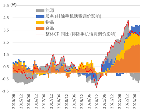 日本通胀反弹 上周五日本公布了10月CPI数据,综合CPI同比增长3.3%(预期3.4%、前值3.0%)、核心CPI(除去生鲜食品)同比增长2.9%(预期3.0%、前值2.8%)、核心核心[12]CPI(除去生鲜食品与能源)同比增长4.0%(预期4.1%、前值4.2%)。综合CPI同比再度反弹的主要原因来自于政府补贴减少所带来的电费价格上升。日本的CPI分拆来看,10月与9月相比,核心部分的物品与服务的贡献度依然维持在高位(图表21),我们认为未来日本的通胀同比或继续持平、同欧美的快速下行有所不同。在通胀高位停留的背景下,我们继续认为日本央行或在2024年1月退出负利率、并在2024年内开启连续加息(详情参考《中金看日银#34: 23年10月会议回顾-YCC的“废除”、2024年或连续加息》)。