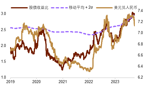 我们认为,房地产行业的政策利好或体现出有关部门愈加关注主要房企的流动性问题,市场信心得到提振,后续更多政策或值得期待。房地产部门作为经济供求的重要一环,市场对于房地产的信心亦对目前的风险溢价有较大影响。我们根据沪深300市盈率和十年期国开债收益率的比值计算的股债性价值指数显示,上周市场风险溢价连续两天回落至其4年移动平均以上两个标准差的水平之下,为一个多月来首次(图表12)。上周风险溢价的改善或对人民币汇率的走强有一定支撑作用。