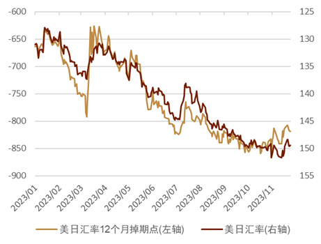 弱美元背景下日元依旧相对偏弱 上周在美元指数继续明显走弱,而日元相较美元仅小幅升值0.13%、基本属于同美元并列成为最弱G10货币。上周一美日汇率始于149.45,但上周二在美元明显走弱背景下美日汇率也跌至147.50附近,但此后伴随美元的反弹,美日汇率再次上升至149.50附近。上周五虽然美元再度疲软,但是美日汇率依旧维持在149.50的附近,反映出了日元目前的弱势相对“根深蒂固”(图表18)。上周受美国方面感恩节、日本方面勤劳感谢日休假的影响,美债在上周四的大部分时间并未开盘,美日汇率与美债10年利率的走势的相关性并不明显(图表19)。美日汇率在上周同美日汇率掉期点依旧出现一定的背离,但边际上波动的方向基本一致 (图表20)。