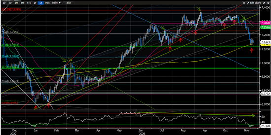 美元/人民币上周继续有所走低但在200天均线附近(图22中黄色线&最右侧红色箭头)找到明显的支撑并且收盘于这条关键的支撑位上方,考虑到日线级别上RSI指数已经跌至年内最为超卖水平,我们认为本周美元可能会有所反弹。8月初高点7.20附近将提供近期关键的阻力,如果美元多头不能成功向上突破,那么一旦美元多头失守200天均线,美元/人民币进一步回落的概率依旧较大。