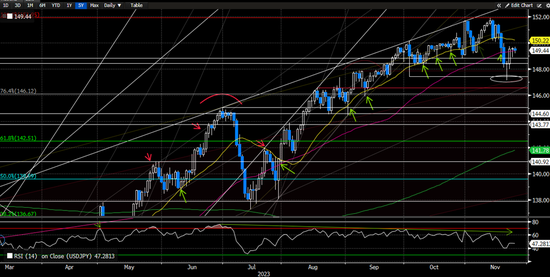 美元/日元上周如期在10月3日的前期低点147.50附近找到支撑之后有所反弹(详见[13]《美元下行态势得以强化》技术分析部分),并且于上周五收盘在55天均线附近(图25中粉色线)。向前看,近期阻力依旧位于关键的21天均线150.20附近(图25中黄色线),如果美元多头无法向上突破这一阻力,美元/日元依旧面临回落风险。鉴于RSI指数依旧处于今年7月以来的下行趋势中,我们依旧认为美元可能进一步走低,尤其如果本周可以跌破10月初的前期低点147.50附近这一近期支撑。