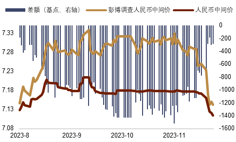 ► 上周(11/20~11/24) :上周人民币在美元回落速度放缓的背景下明显上涨。我们认为主要原因或是中间价的连续大幅高开带动了短期升值预期,以及利好房地产部门的相关消息带动了风险情绪。